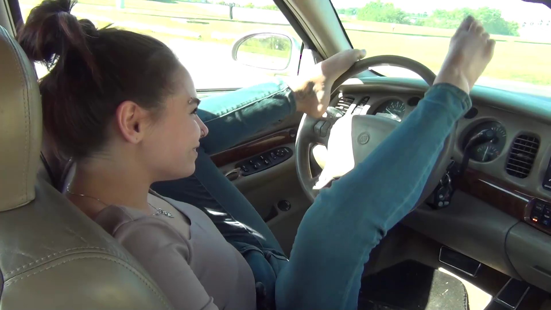 Candice pulls up picking up a friend, she isn't driving her personal car, she borrowed one, but it has some issues. They greet each other and starts driving down the road. Her friend tells her that its a very nice car its comfortable but very old school! Candice slips off her flip flops and starts driving bare foot. Her friend asks her why shes driving like that? Candice tells her its better driving this way where she can really feel the big pedals! Her friend shrugs it off and they drive. Suddenly the car stalls! Candice freaks and starts pumping it and trying to crank it but nothing! Her friend try's telling her some tips on how to get the car started! Candice try's again but nothing, she then tells her to hold the pedal down, and crank it, suddenly it starts!! They take off down the road, and go to a gas station. They get some coffees and head back out to the car. She puts the key in but its dead! She starts pumping and cranking yet again but nothing! Does Candice make it back? Or is she stranded with her friend in a piece of shit Buick?!