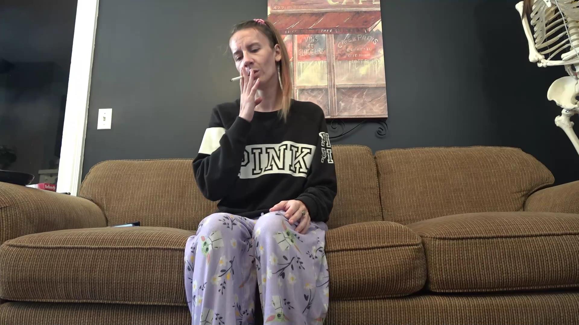 Shaylee is sitting on the wooden chair, she lights up a cigarette and she can't handle the smoke. She begins coughing and lays back as her lungs fill with smoke. The sexy, mature Shaylee dangles her cig out the corner of her mouth, smacks her flip flops and smokes the entire clip.