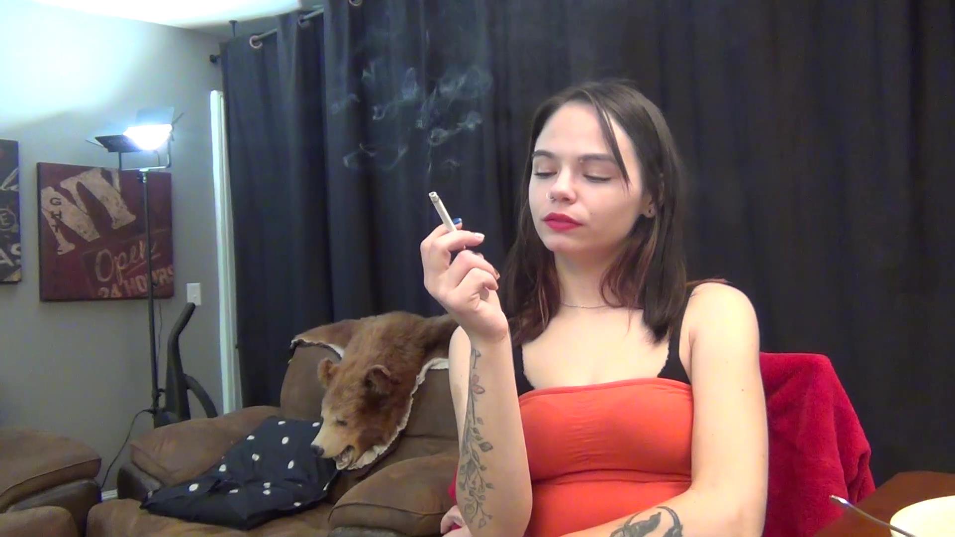 Mitzy is full on fish and ramen and is ready for a cig! She dangles her big slippers, snap inhales, blows smoke into the cup, letting it slowly rise. Mitzy is so sexy while she smokes. She talks dirty and enjoys every hit while she blackens her lungs!