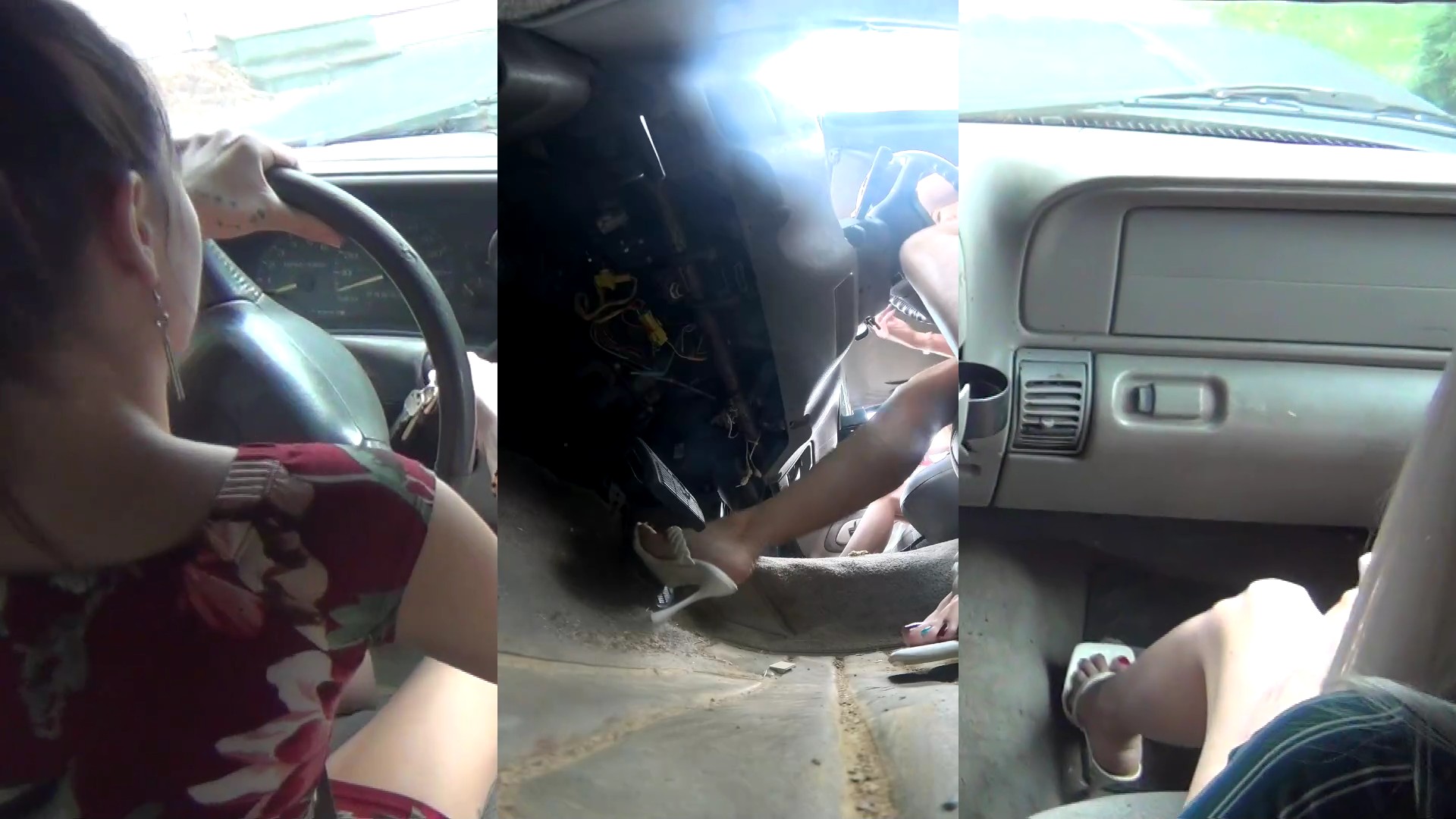So basically they got their car fixed and the mechanic told them they were just low on brake fluid and the brake line hasn’t been changed in a long time, hence the puddle of brake fluid they found there. He also said the car is old but the brakes should be fine. Just pump the brakes. Thus the two were convince the car was just old and the brakes were old. They were eating at a burger restaurant and went to the bathroom before leaving to go shopping at the mall. Unknown to them, the hired professional is back and once again tampered with the brakes. This time, he had a bucket to allow the brake fluid land there to avoid suspicion of brake fluid on the road. As the girls are on the road, driving barefoot despite the brakes mushy, they still remain convinced of the car being old, and just pump the brakes. They arrived at the mall happily shopping. But on the freeway, things took a turn for worse as they head back home. (This is a Typical Brake Failure clip with heels and bare feet with some good fast food barefoot under table scenes!)