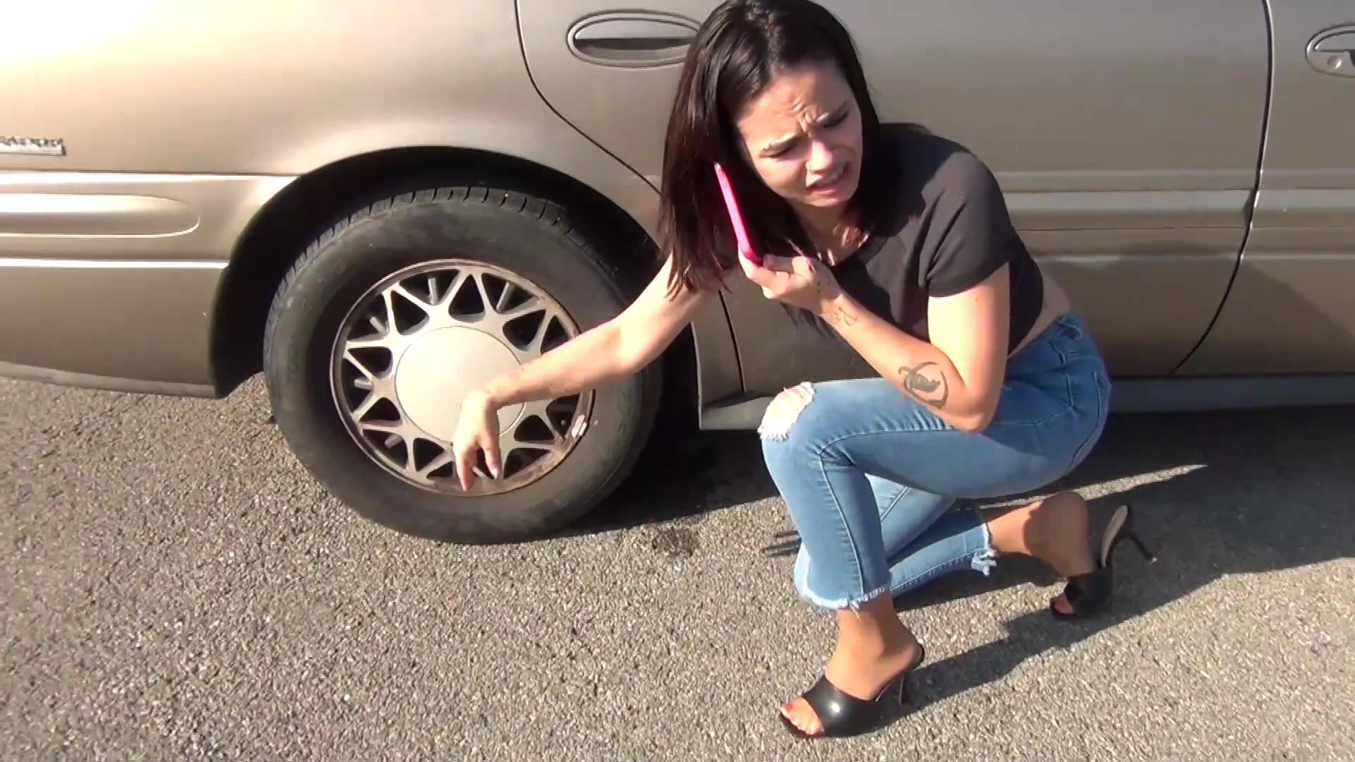 Mitzi works at a health center and discovers it's being used to hide insurance fraud. While she is gathering her evidence someone is out by her car cutting the brake line. She heads out to her car wearing a blouse short skirt suntan pantyhose and the shoes I just sent you She drives away leaving a puddle behind. As she's driving she notices the brakes feeling soft but continues driving. Suddenly the brakes are gone. After alot of brake pumping she finally gets the car to stop by using the emergency brake. She gets out to see a puddle by the tire and gets back into the car and calls for help explaining her situation pumping the brake pedal the entire time. The second scene She is in different outfit and the same thing happens and a stuck Throttle!